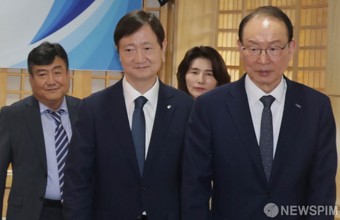 [서울=뉴스핌] 양윤모 기자 = 이찬진 금융감독원장이 14일 오후 서울 서대문구 한국공인회계사 회관에서 개최된 '금융감독원장-회계법인 최고경영자(CEO) 간담회'에 참석 기념촬영을 마치고 자리로 이동하고 있다. 이자리에는 최운열 한국공인회계사회 회장,윤훈수 삼일회계법인 대표이사,김교태 삼정회계법인 대표이사,박용근 한영회계법인 대표,홍종성 안진회계법인 대표 등 12개 회계법인 대표들이 참석했다. 2025.10.14 yym58@newspim.com