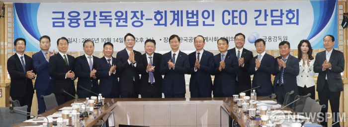 [서울=뉴스핌] 양윤모 기자 = 이찬진 금융감독원장(왼쪽 여덟 번째)이 14일 오후 서울 서대문구 한국공인회계사 회관에서 개최된 '금융감독원장-회계법인 최고경영자(CEO) 간담회'에 참석 기념촬영을 하고 있다. 이자리에는 최운열 한국공인회계사회 회장,윤훈수 삼일회계법인 대표이사,김교태 삼정회계법인 대표이사,박용근 한영회계법인 대표,홍종성 안진회계법인 대표 등 12개 회계법인 대표들이 참석했다. 2025.10.14 yym58@newspim.com