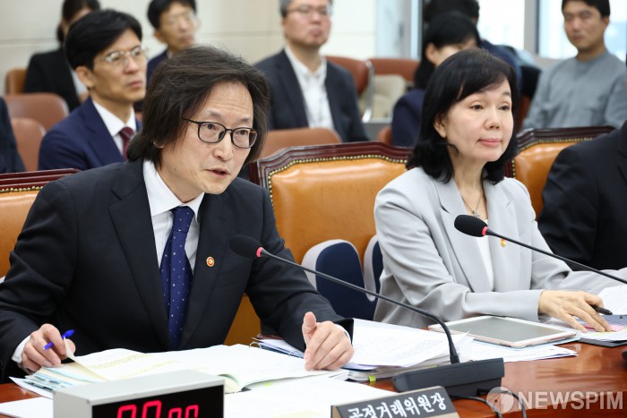 [서울=뉴스핌] 최지환 기자 = 주병기 공정거래위원장이 14일 오전 서울 여의도 국회 정무위원회에서 열린 공정거래위원회, 개인정보보호위원회 등 국정감사에서 의원 질의에 답변하고 있다. 2025.10.14 choipix16@newspim.com