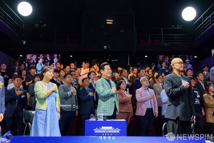 [서울=뉴스핌] 이재명 대통령이 14일 서울 동대문구 콘텐츠문화광장에서 열린 디지털토크라이브 '국민의 목소리, 정책이 되다'에서 국기에 대한 경례를 하고 있다. [사진=대통령실] 2025.10.14 photo@newspim.com