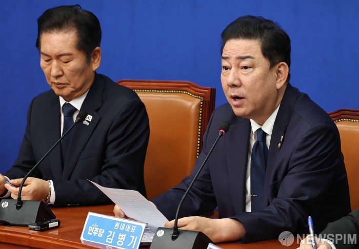 [서울=뉴스핌] 윤창빈 기자 = 김병기 더불어민주당 원내대표가 15일 오전 서울 여의도 국회에서 열린 최고위원회의에서 모두발언을 하고 있다. 2025.10.15 pangbin@newspim.com