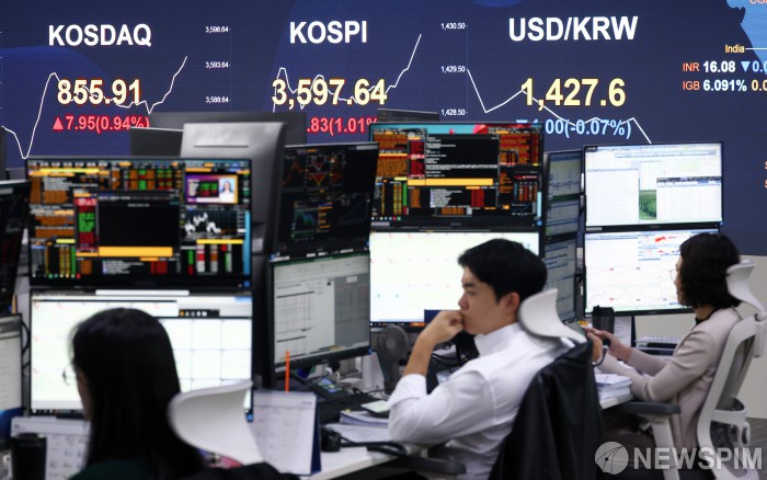 [서울=뉴스핌] 최지환 기자 = 15일 코스피가 18.83포인트(0.53%) 상승한 3580.64에 개장했다. 코스닥지수는 전 거래일보다 5.21포인트(0.61%) 오른 853.17에 거래를 시작했다. 서울외환시장에서 달러/원 환율은 전날보다 1.9원 내린 1429.1원에 출발했다. 이날 오전 서울 영등포구 국민은행 딜링룸에서 딜러들이 업무를 보고 있다. 2025.10.15 choipix16@newspim.com