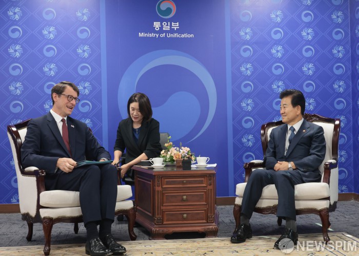 [서울=뉴스핌] 이길동 기자 = 정동영 통일부 장관이 15일 오전 서울 종로구 정부서울청사에서 필립 베르투 주한프랑스대사를 접견하고 있다. 2025.10.15 gdlee@newspim.com