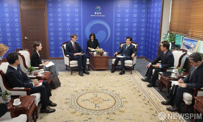 [서울=뉴스핌] 이길동 기자 = 정동영 통일부 장관이 15일 오전 서울 종로구 정부서울청사에서 필립 베르투 주한프랑스대사를 접견하고 있다. 2025.10.15 gdlee@newspim.com