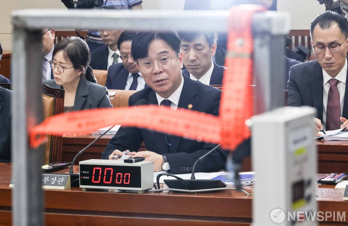 [서울=뉴스핌] 윤창빈 기자 = 김영훈 고용노동부 장관이 15일 오전 서울 여의도 국회에서 열린 기후에너지환경노동위원회의 고용노동부 국정감사에서 의원 질문에 답변하고 있다. 2025.10.15 pangbin@newspim.com