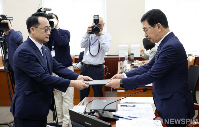 [서울=뉴스핌] 정일구 기자 = 허철훈 중앙선거관리위원회 사무총장이 15일 오전 서울 여의도 국회 행정안전위원회에서 열린 중앙선거관리위원회 등에 대한 국정감사에서 신정훈 위원장에게 증인선서문을 전달하고 있다. 2025.10.15 mironj19@newspim.com