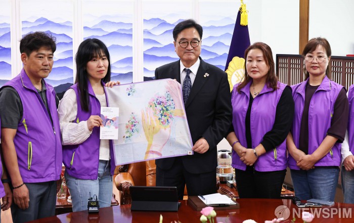 [서울=뉴스핌] 윤창빈 기자 = 우원식 국회의장이 15일 오후 서울 여의도 국회에서 10.29 이태원참사 유가족들과 면담 전 기념촬영을 하고 있다. 2025.10.15 pangbin@newspim.com