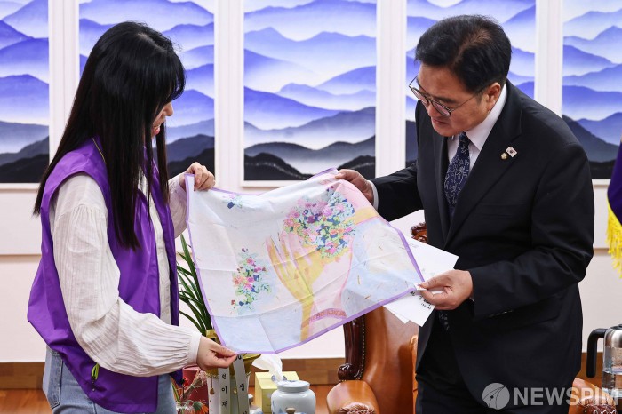 [서울=뉴스핌] 윤창빈 기자 = 우원식 국회의장이 15일 오후 서울 여의도 국회에서 10.29 이태원참사 유가족으로 부터 손수건을 선물 받고 있다. 2025.10.15 pangbin@newspim.com