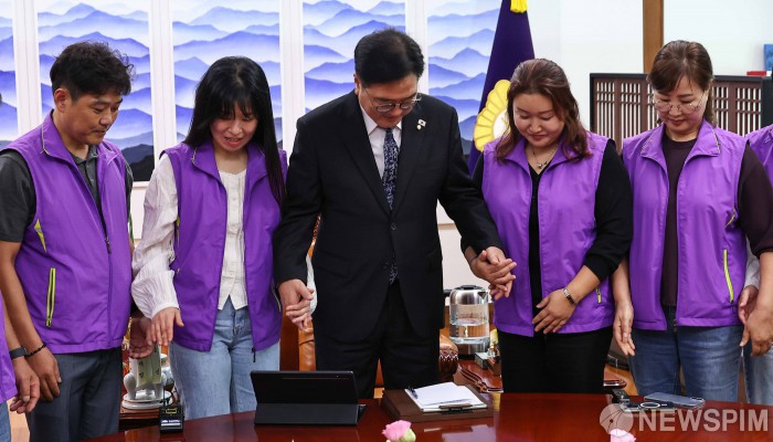 [서울=뉴스핌] 윤창빈 기자 = 우원식 국회의장이 15일 오후 서울 여의도 국회에서 10.29 이태원참사 유가족들과 면담 전 기념촬영을 하고 있다. 2025.10.15 pangbin@newspim.com