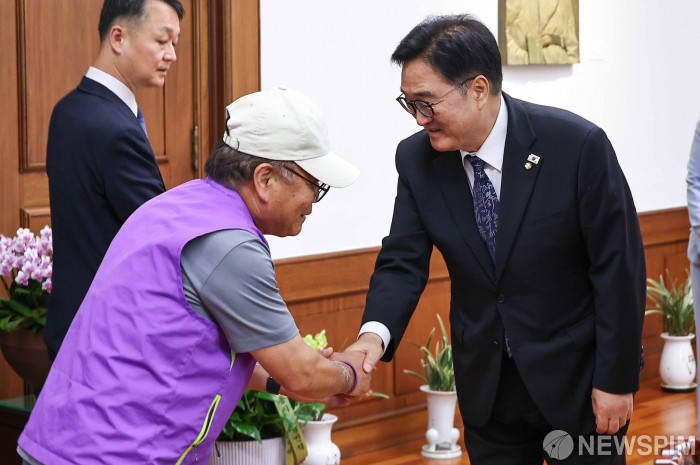 [서울=뉴스핌] 윤창빈 기자 = 우원식 국회의장이 15일 오후 서울 여의도 국회에서 10.29 이태원참사 유가족들과 면담 전 인사를 나누고 있다. 2025.10.15 pangbin@newspim.com