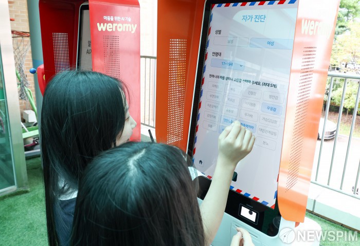 [파주=뉴스핌] 최지환 기자 = 한가람중학교 재학생들이 15일 오후 경기 파주시 한가람중학교에서 열린 '2025 경기도교육청 찾아가는 생명존중 캠페인'에서 AI 기반 마음상담 기기 '위로미'를 체험하고 있다. 2025.10.15 choipix16@newspim.com