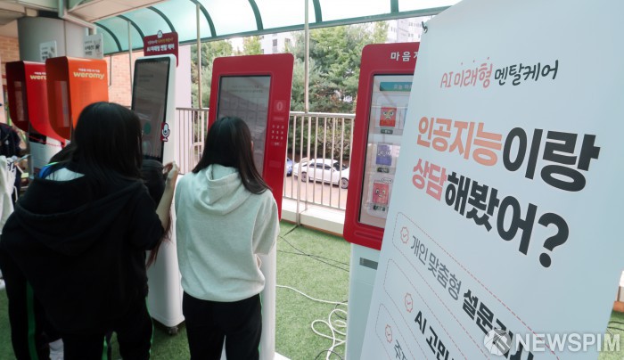 [파주=뉴스핌] 최지환 기자 = 한가람중학교 재학생들이 15일 오후 경기 파주시 한가람중학교에서 열린 '2025 경기도교육청 찾아가는 생명존중 캠페인'에서 AI 기반 마음상담 기기 '위로미'를 체험하고 있다. 2025.10.15 choipix16@newspim.com