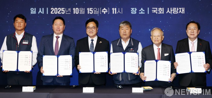 [서울=뉴스핌] 정일구 기자 = 우원식 국회의장과 노사 5단체 대표들이 15일 서울 여의도 국회 사랑재에서 열린 국회 사회적 대화 공동 선언식에서 선언문에 서명한 뒤 기념촬영을 하고 있다. 왼쪽부터 양경수 민주노총 위원장, 최태원 대한상의 회장, 우 의장, 김동명 한국노총 위원장, 손경식 경총 회장, 김기문 중기중앙회장. 2025.10.15 mironj19@newspim.com