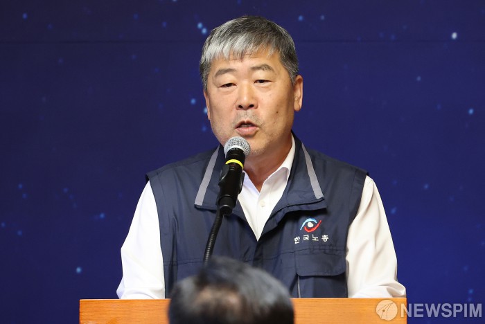 [서울=뉴스핌] 정일구 기자 = 김동명 한국노총 위원장이 15일 오전 서울 여의도 국회 사랑재에서 열린 국회 사회적 대화 공동 선언식에서 인사말을 하고 있다. 2025.10.15 mironj19@newspim.com