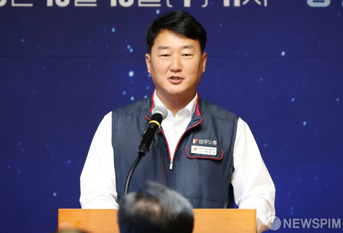 [서울=뉴스핌] 정일구 기자 = 양경수 민주노총 위원장이 15일 오전 서울 여의도 국회 사랑재에서 열린 국회 사회적 대화 공동 선언식에서 인사말을 하고 있다. 2025.10.15 mironj19@newspim.com