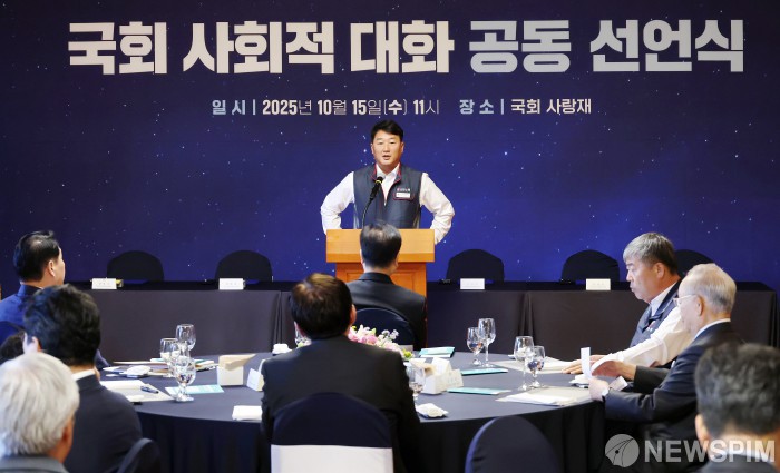 [서울=뉴스핌] 정일구 기자 = 양경수 민주노총 위원장이 15일 오전 서울 여의도 국회 사랑재에서 열린 국회 사회적 대화 공동 선언식에서 인사말을 하고 있다. 2025.10.15 mironj19@newspim.com