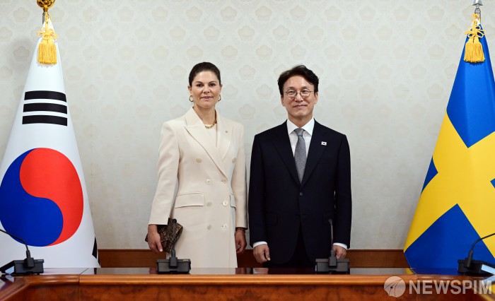 [서울=뉴스핌] 청사사진기자단= 김민석 국무총리가 15일 오후 서울 종로구 정부서울청사에서 스웨덴 왕위 계승권자로 방한한 빅토리아 잉그리드 알리스 데씨리에 스웨덴 왕세녀와 면담 전 기념촬영을 하고 있다. 2025.10.15 photo@newspim.comm.com