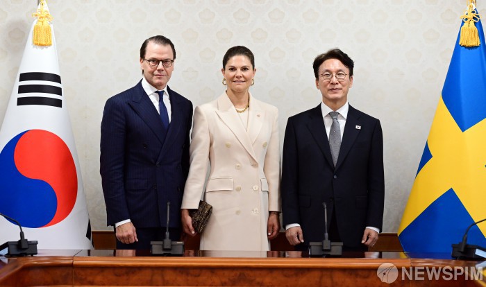 [서울=뉴스핌] 청사사진기자단= 김민석 국무총리가 15일 오후 서울 종로구 정부서울청사에서 스웨덴 왕위 계승권자로 방한한 빅토리아 잉그리드 알리스 데씨리에 스웨덴 왕세녀와 배우자 다니엘 왕자와 기념촬영을 하고 있다.2025.10.15 photo@newspim.comm.com
