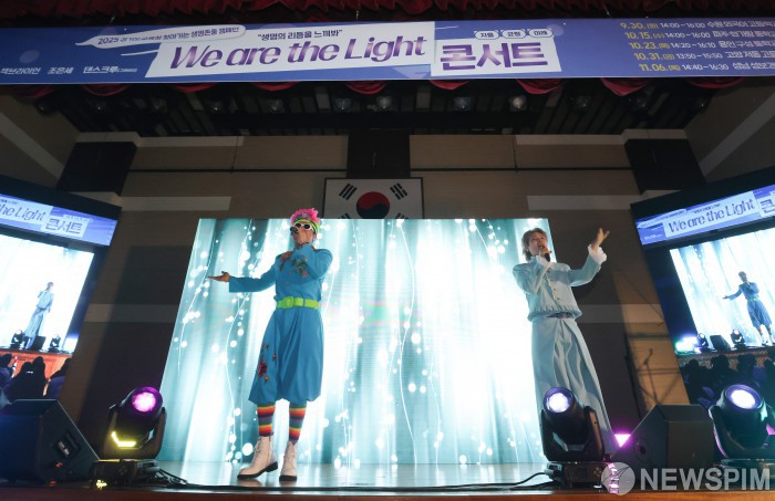 [파주=뉴스핌] 최지환 기자 = 가수 노라조가 15일 오후 경기 파주시 한가람중학교에서 열린 '2025 경기도교육청 찾아가는 생명존중 캠페인'에서 공연을 펼치고 있다. 2025.10.15 choipix16@newspim.com