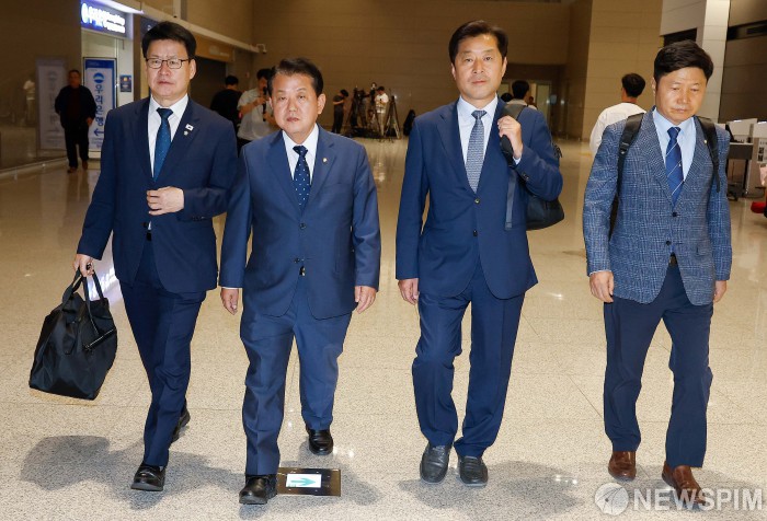 [영종도=뉴스핌] 류기찬 기자 = 김병주 더불어민주당 의원을 단장으로 한 재외국민안전 TF팀이 한국인 납치, 구금 사태에 대응하기 위해 15일 오후 인천국제공항 제2여객터미널에서 캄보디아로 출국하고 있다. 2025.10.15 ryuchan0925@newspim.com