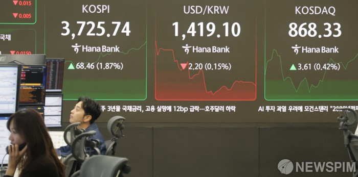 [서울=뉴스핌] 양윤모 기자 = 한미 무역협상의 최종 타결이 가시권에 들어온 가운데, 16일 오전 코스피가 전장 종가보다 68.46 포인트(1.87%) 상승하며 3725.74로, 코스닥은 3.61 포인트(0.42%) 상승한 868.33으로 장을 시작한 가운데, 서울 중구 하나은행 딜링룸에서 직원들이 업무를 보고 있다. 서울외환시장에서 달러/원 환율은 전장 대비 2.20원 하락한 1419.10원에 거래를 시작했다. 2025.10.16 yym58@newspim.com