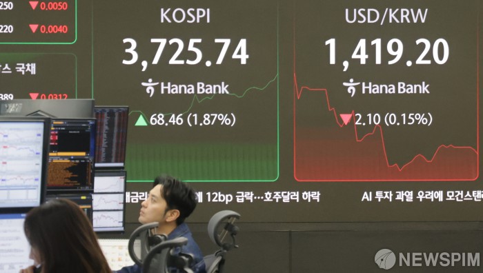 [서울=뉴스핌] 양윤모 기자 = 한미 무역협상의 최종 타결이 가시권에 들어온 가운데, 16일 오전 코스피가 전장 종가보다 68.46 포인트(1.87%) 상승하며 3725.74로, 코스닥은 3.61 포인트(0.42%) 상승한 868.33으로 장을 시작한 가운데, 서울 중구 하나은행 딜링룸에서 직원들이 업무를 보고 있다. 서울외환시장에서 달러/원 환율은 전장 대비 2.10원 하락한 1419.20원에 거래를 시작했다. 2025.10.16 yym58@newspim.com