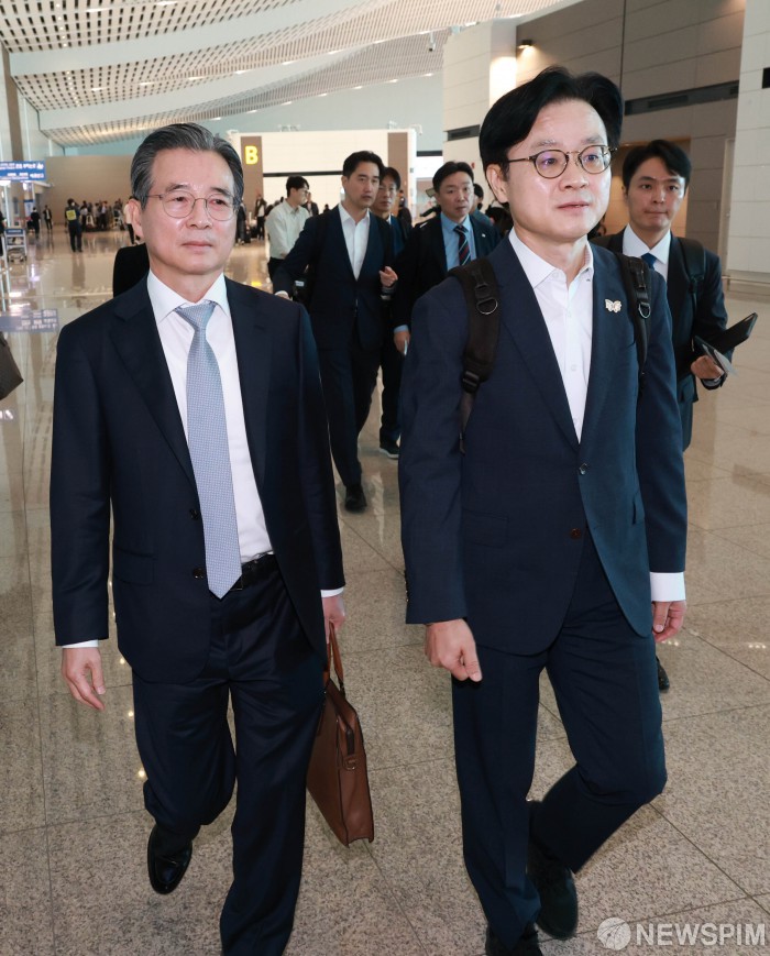 [영종도=뉴스핌] 김학선 기자 = 김용범 대통령실 정책실장과 김정관 산업통상자원부 장관이 16일 한미 관세 협상 후속 협의를 위해 인천국제공항을 통해 미국으로 출국하고 있다. 2025.10.16 yooksa@newspim.com