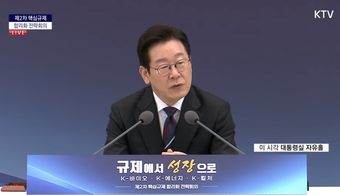 [서울=뉴스핌] 박성준 기자 = 이재명 대통령이 16일 오전 용산 대통령실에서 열린 제2차 핵심규제 합리화 전략회의에서 발언하고 있다. [사진=KTV 캡쳐] 2025.10.16 parksj@newspim.com |