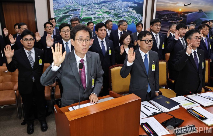 [서울=뉴스핌] 윤창빈 기자 = 함진규 한국도로공사 사장이 16일 오전 서울 여의도 국회에서 열린 국토교통위원회의 한국도로공사 등에 대한 국정감사에서 선서를 하고 있다. 2025.10.16 pangbin@newspim.com