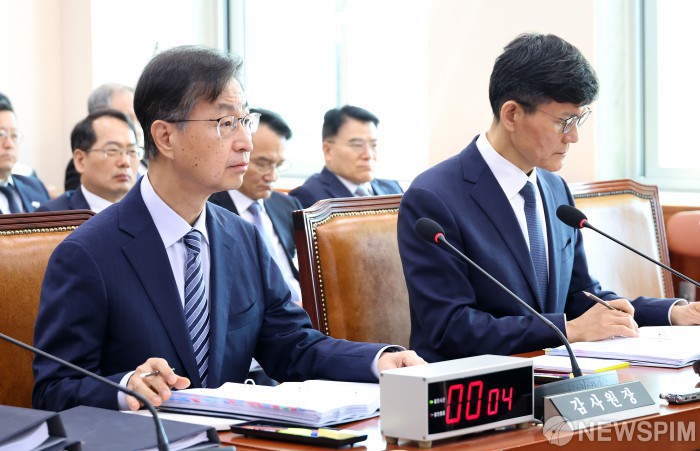 [서울=뉴스핌] 정일구 기자 = 최재해 감사원장과 정상우 사무총장이 16일 오전 서울 여의도 국회 법제사법위원회에서 열린 감사원에 대한 국정감사에 출석해 있다. 2025.10.16 mironj19@newspim.com