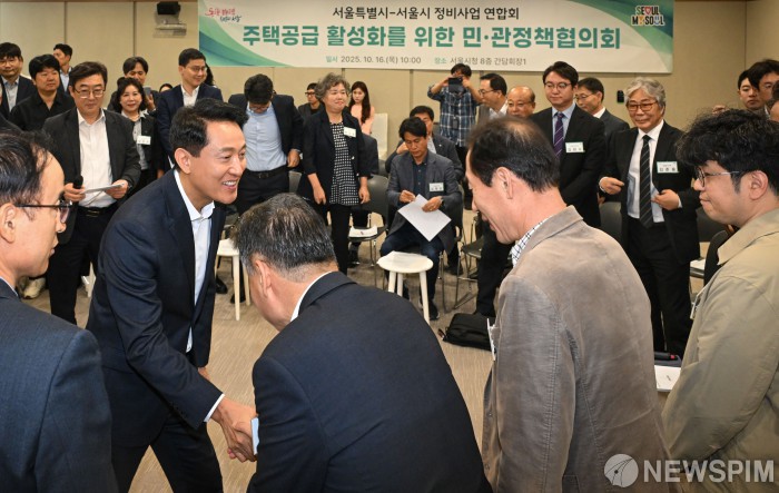 [서울=뉴스핌] 양윤모 기자 = 오세훈 서울시장이 16일 오전 서울시청에서 서울시 정비사업 연합회와 개최한 '주택공급 활성화를 위한 민·관정책협의회'에서 참석자들과 악수하고 있다. [공동취재] 2025.10.16 yym58@newspim.com