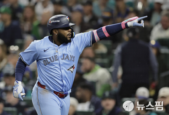 [시애틀 로이터=뉴스핌] 토론토의 블라디미르 게레로 주니어가 16일에 열린 시애틀과의 ALCS 3차전에서 5회 솔로 홈런을 기록한 뒤 세리머니 하고 있다. 2025.10.16 wcn05002@newspim.com