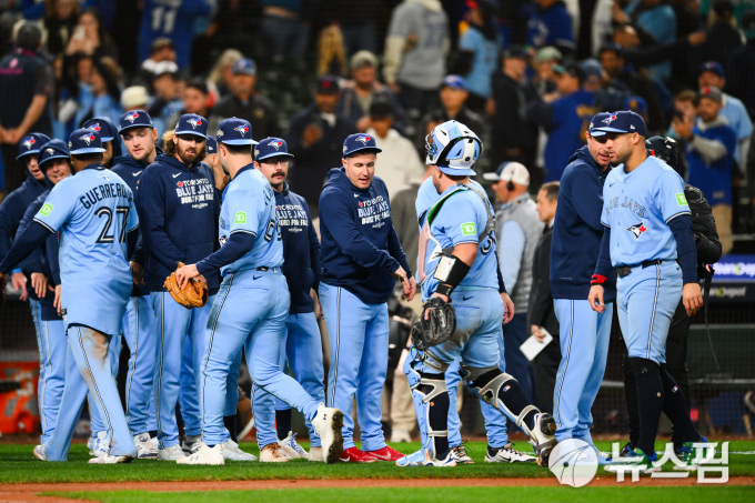 [시애틀 로이터=뉴스핌] 토론토 선수들이 16일에 열린 시애틀과의 ALCS 3차전에서 13-4로 승리를 거둔 뒤 축하하고 있다. 2025.10.16 wcn05002@newspim.com