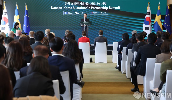 [서울=뉴스핌] 문신학 산업통상부 차관이 16일 서울 용산구 그랜드 하얏트호텔에서 열린 한-스웨덴 지속가능 파트너십 서밋에서 인사말을 하고 있다. [사진=산업통상부] 2025.10.16 photo@newspim.com