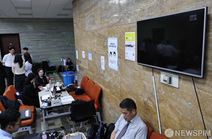 [서울=뉴스핌] 윤창빈 기자 = 16일 오후 서울 여의도 국회에서 열린 과학기술정보방송통신위원회 국정감사가 최민희 위원장이 취재진 퇴장을 선언해 비공개로 진행되자 방송 송출이 중단되어 있다. 2025.10.16 pangbin@newspim.com