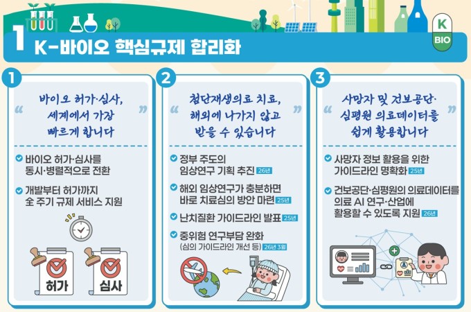 정부는 K-바이오에 대한 규제를 완화해 새로운 국가 성장의 동력을 확보한다. 보건복지부는 첨단재생의료 활성화, 바이오 허가·심사 규제 완화, 데이터 활용 확대를 추진한다.