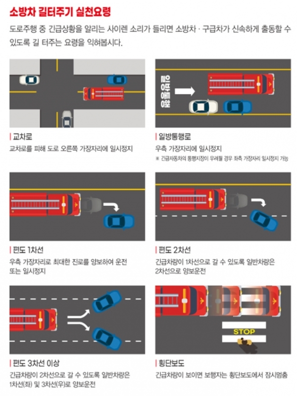 [천안=뉴스핌] 오영균 기자 = 충남 천안서북소방서는 화재나 응급상황 발생 시 골든타임 확보를 위해 운전자들의 자발적인 '소방차 길 터주기' 실천을 16일 당부했다.