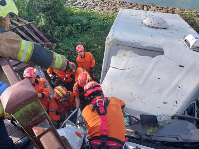 신고를 받은 하동소방서는 인력 21명과 장비 7대를 투입해 탑차에 타고 있던 3명을 구조했다.