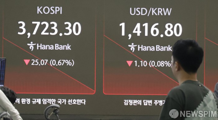[서울=뉴스핌] 양윤모 기자 = 17일 오전 코스피가 전장 종가보다 25.07 포인트(0.67%) 하락하며 3723.30으로, 코스닥은 3.41 포인트(0.39%) 하락한 862.00로 장을 시작한 가운데, 서울 중구 하나은행 딜링룸에서 직원들이 업무를 보고 있다. 서울외환시장에서 달러/원 환율은 전장 대비 1.10원 하락한 1416.80원에 거래를 시작했다. 2025.10.17 yym58@newspim.com