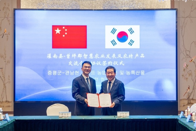 [증평=뉴스핌] 백운학 기자 = 충북 증평군이 자매도시인 중국 장쑤성(江蘇省) 관남현(灌南縣)과 손잡고 스마트 농업 발전과 농·특산물 교류 활성화를 위한 업무 협약을 체결했다.