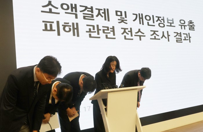 [서울=뉴스핌] 양윤모 기자 = 최근 KT 불법 기지국 20여개가 추가로 발견된 가운데, KT 소액결제 피해 관련 기자 브리핑이 17일 서울 KT 광화문 West 사옥에서 서창석 KT 네트워크 부문 부사장(왼쪽)과 임원진이 참석해 추가적으로 확인된 사항을 발표하고 고개숙여 인사하고 있다. 2025.10.17 yym58@newspim.com |
