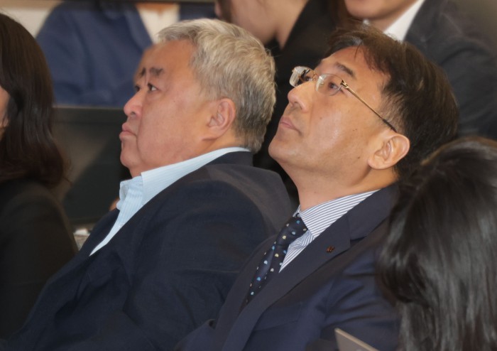 [서울=뉴스핌] 양윤모 기자 = 최근 KT 불법 기지국 20여개가 추가로 발견된 가운데, 17일 서울 KT 광화문 West 사옥에서 서창석 KT 네트워크 부문 부사장(오른쪽)과 이현석 KT 부사장이 KT 소액결제 피해 관련 기자 브리핑을 하기전 생각하고 있다. 2025.10.17 yym58@newspim.com |