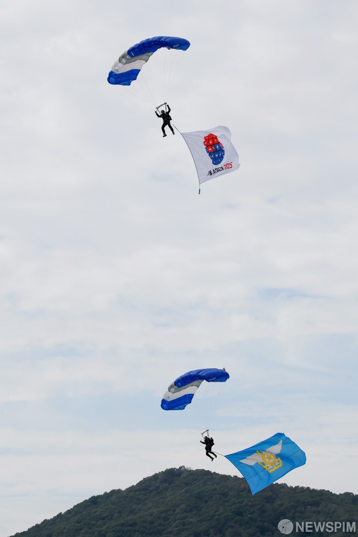 [성남=뉴스핌] 류기찬 기자 = 2025 서울 ADEX 개막일인 17일 오후 경기 성남시 서울공항에서 공군 특수부대 고공강하팀이 강하를 선보이고 있다. 2025.10.17 ryuchan0925@newspim.com