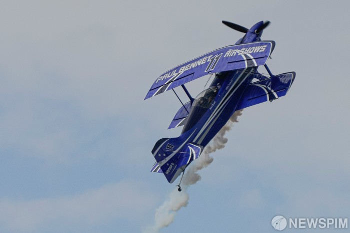 [성남=뉴스핌] 류기찬 기자 = 2025 서울 ADEX 개막일인 17일 오후 경기 성남시 서울공항에서 호주 곡에비행팀 폴 베넷이 곡예비행을 선보이고 있다. 2025.10.17 ryuchan0925@newspim.com