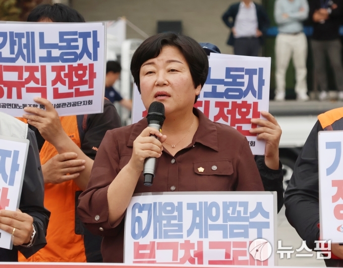 [광주=뉴스핌] 박진형 기자 = 손혜진 광주 북구의원(용봉·매곡·일곡·삼각동, 진보당)이 17일 북구청사 앞에서 개최된 민주노총 공공연대노동조합 광주 북구시설관리공단지회 주최 기자회견에 참석해 기간제 근로자의 정규직 전환을 함께 촉구했다. 2025.10.17 bless4ya@newspim.com