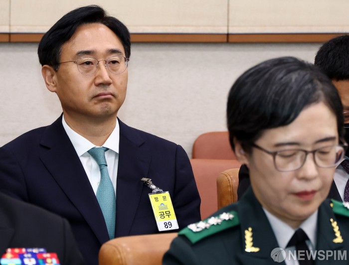 [서울=뉴스핌] 최지환 기자 = 신범철 전 국방부차관이 17일 오후 서울 여의도 국회 법제사법위원회에서 열린 군사법원 등에 대한 국정감사에 증인으로 출석해 있다. 2025.10.17 choipix16@newspim.com