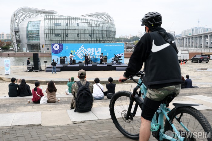 [서울=뉴스핌] 정일구 기자 = '히든스테이지 시즌3 TOP10' 널디나가 18일 오후 서울 서초구 반포한강공원 세빛섬 야외무대에서 감엔터테인먼트 주최로 열린 '2025 한강 청년 버스킹 축제'에서 라이브 공연을 선보이고 있다. 2025.10.18 mironj19@newspim.com