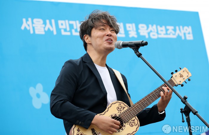 [서울=뉴스핌] 정일구 기자 = '히든스테이지 시즌3 TOP10' 김지신이 18일 오후 서울 서초구 반포한강공원 세빛섬 야외무대에서 감엔터테인먼트 주최로 열린 '2025 한강 청년 버스킹 축제'에서 라이브 공연을 선보이고 있다. 2025.10.18 mironj19@newspim.com