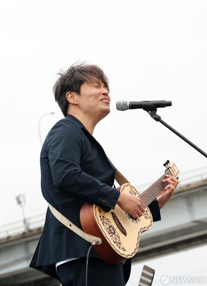 [서울=뉴스핌] 정일구 기자 = '히든스테이지 시즌3 TOP10' 김지신이 18일 오후 서울 서초구 반포한강공원 세빛섬 야외무대에서 감엔터테인먼트 주최로 열린 '2025 한강 청년 버스킹 축제'에서 라이브 공연을 선보이고 있다. 2025.10.18 mironj19@newspim.com