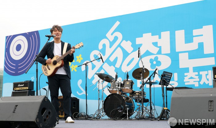 [서울=뉴스핌] 정일구 기자 = '히든스테이지 시즌3 TOP10' 김지신이 18일 오후 서울 서초구 반포한강공원 세빛섬 야외무대에서 감엔터테인먼트 주최로 열린 '2025 한강 청년 버스킹 축제'에서 라이브 공연을 선보이고 있다. 2025.10.18 mironj19@newspim.com